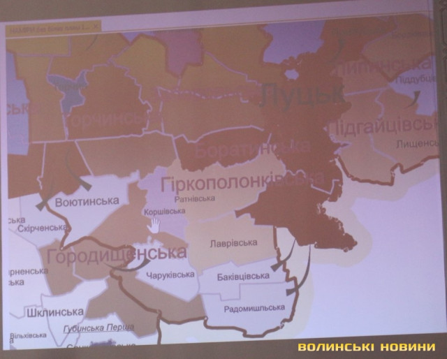 Зі слів сільської голови, ОТГ у складі Гіркополонківської, Лаврівської та Ратнівської сільрад матиме населення у 7,3 тисячі жителів та буде економічно спроможною.Своєю чергою, перший заступник Луцького міського голови Григорій Недопад зауважив, що пропонують внести зміни до перспективного плану і окрім Прилуцької сільради Ківерцівського району включити до складу Луцької ОТГ Гіркополонківську, Коршівську, Лаврівську, Чаруківську, Баківцівську та Радомишльську сільради. У такому разі вилучення реверсної дотації з бюджету Луцька буде мінімальним.