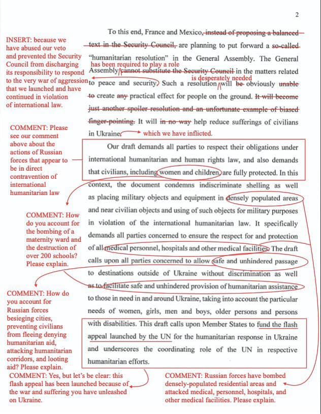Канадці виправили: «Ви атакуєте цивільних, бомбардуєте школи та лікарні, розкрадаєте гуманітарну допомогу. Тому нам здається, що ви насправді не дуже цим стурбовані. Поясніть цей момент».