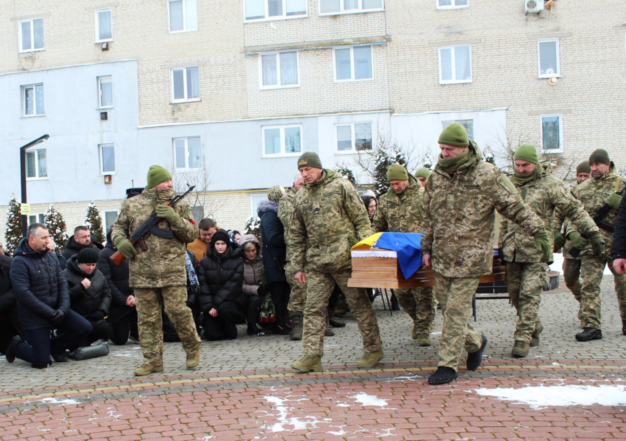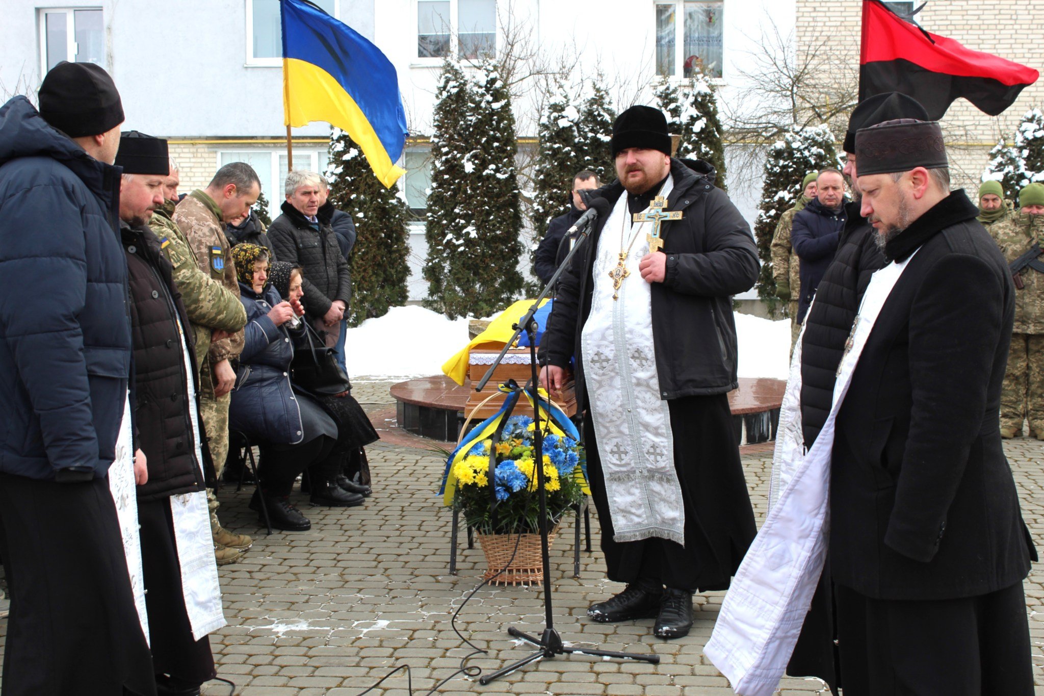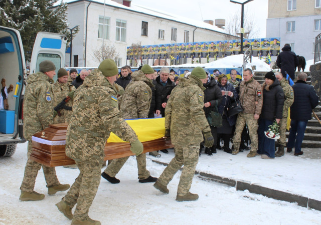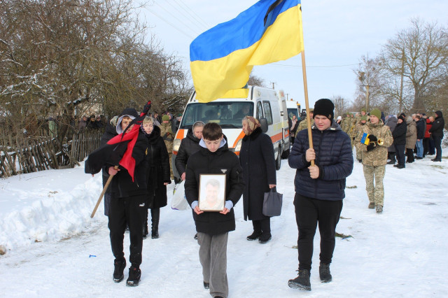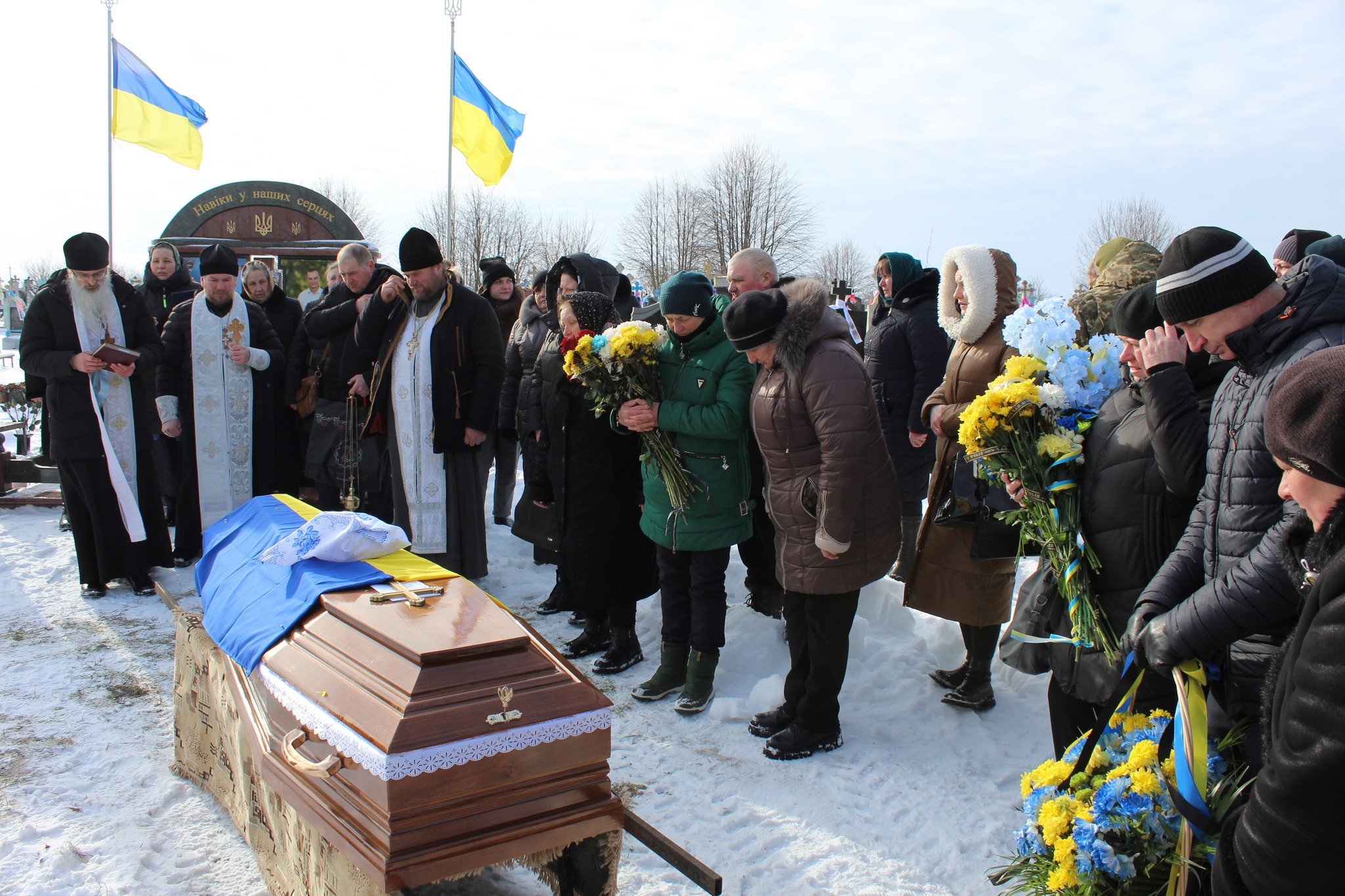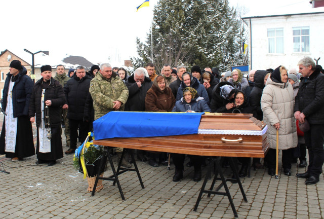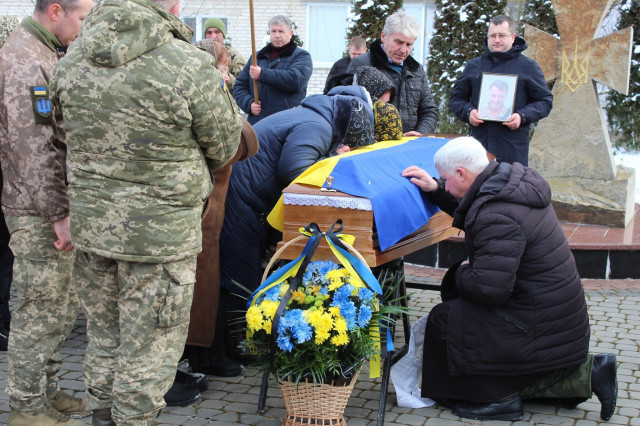 Біля домовини Героя, вкритої національним стягом, у смутку та сльозах – велика родина. У військових строях – брат та племінник загиблого Героя, вони теж захищають Україну.