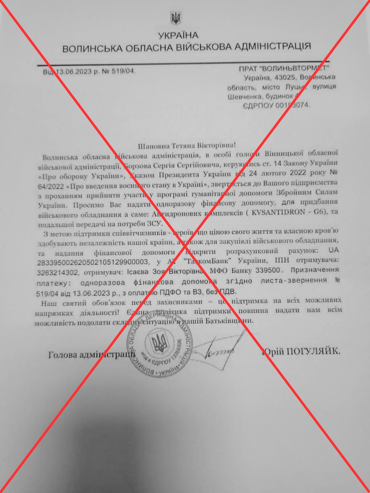 «Нагадуємо, Волинська ОВА НЕ надсилає таких листів.