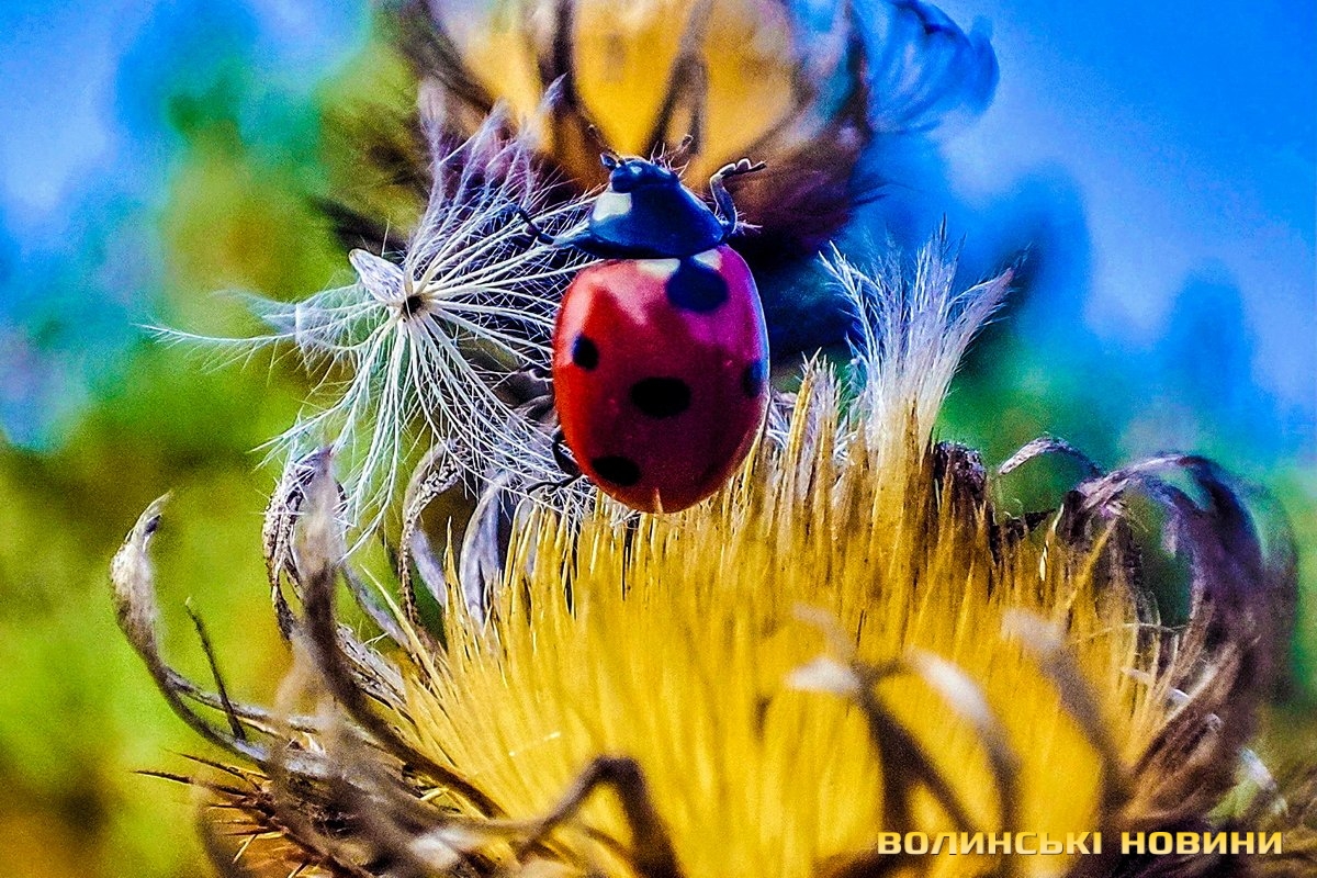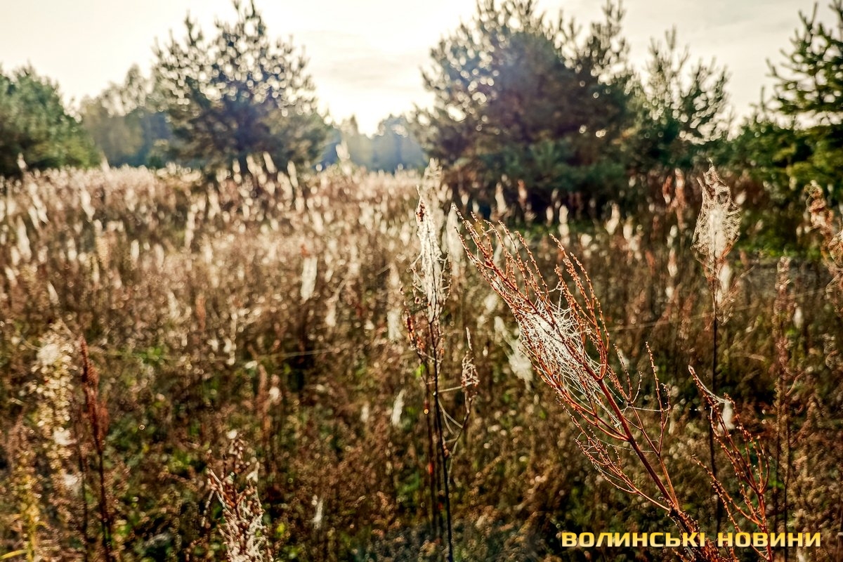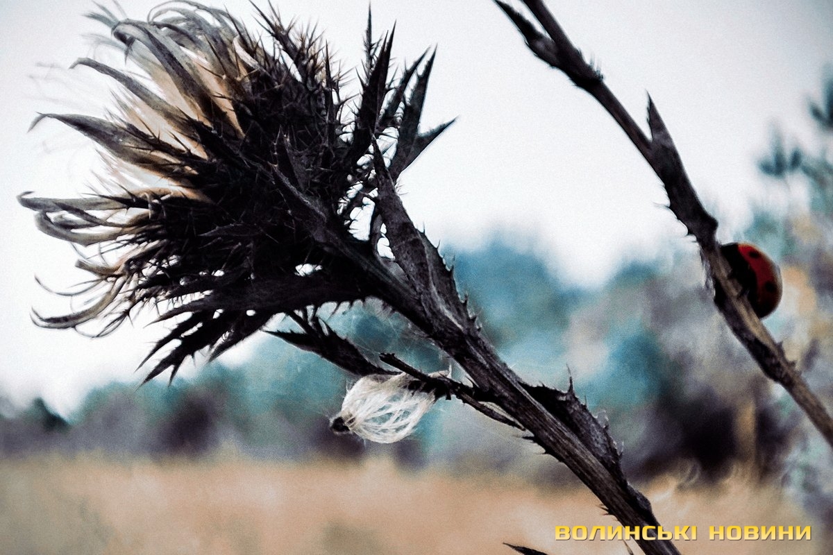 Село Розничі зустріло ранковим туманом, який віщував гарну погоду вдень. Роса під ногами – наче тисячі кришталіків. І на кожній травині вітання з бабиного літа – клапті павутиння, що кудись потім зникло, наче забутий сон.Тут мальовничі польові краєвиди зовсім інші. Справді, міська осінь – похмуріша. Під високим блакитним небом листочки контрастно вирізняються відтінками жовтого. І навіть засохлі квіти не викликають почуття щемливого смутку за літом, яке залишилося в минулому.З-поміж трави виринають гриби – не зовсім їстивні, але такі гарні на фото. Клаптик зелені чудово контрастує з червоно-жовтим. Комашка сонечко або бедрик, як їх називають, з останніх сил намагається подолати чергову вершину.І фінальним акордом над цим усім звучить прощальна пісня птахів, які зібралися у довгу дорогу.
