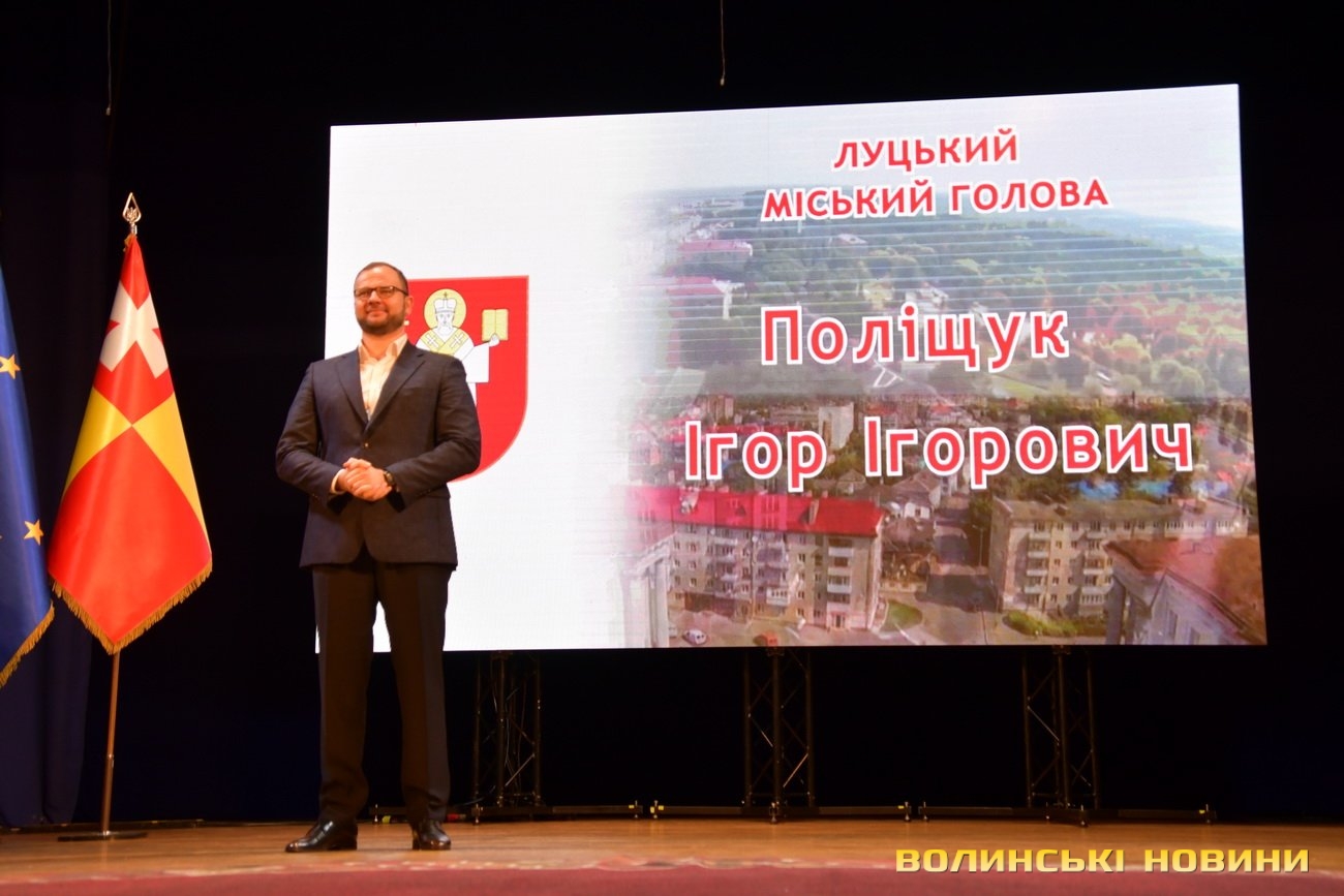 Присутні привітали його стоячи.Заразом Ігор Поліщук склав присягу посадової особи місцевого самоврядування: «Я, Поліщук Ігор Ігорович, усвідомлюючи свою високу відповідальність, урочисто присягаю, що буду вірно служити громаді міста Луцька та народові України, неухильно дотримуватися Конституції України та законів України, сприяти втіленню їх у життя, охороняти права, свободи і законні інтереси громадян, сумлінно виконувати свої посадові обов’язки».Читайте також: Ігор Поліщук склав присягу міського голови Луцька