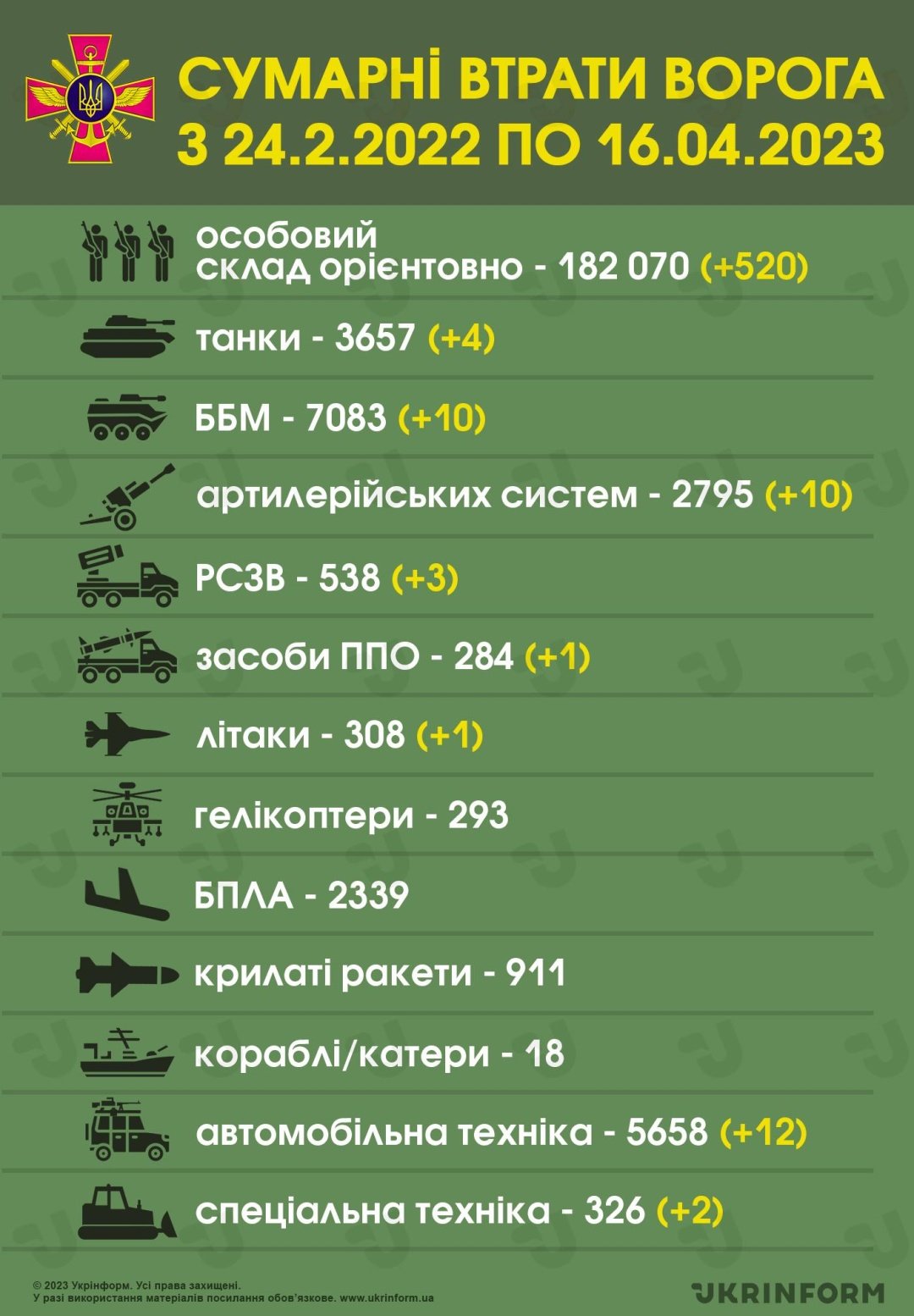 Також зазнаається, що сили оборони України з 24 лютого 2022 року по 16 квітня 2023 року ліквідували близько 182 тисяч 70 російських загарбників, і лише за минулу добу - ще 520 осіб.