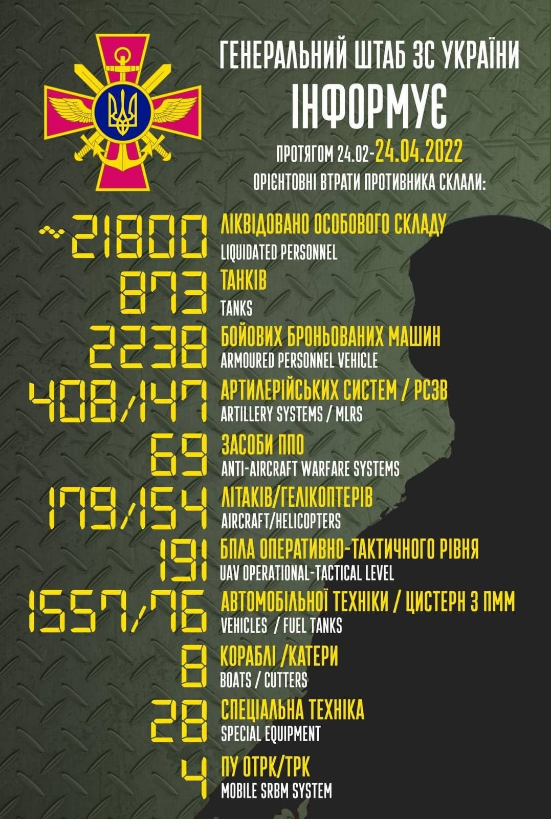 Українські захисники з 24 лютого по 24 квітня знищили близько 21 800 російських військових.