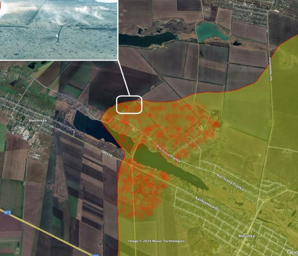 Як пише експерт видання з аналізу відкритих даних Юліан Рьопке з посиланням на кадри з передової, після захоплення руїн Мар’їнки Донецької області окупаційні сили намагаються просуватися на захід. Перший населений пункт на шляху ворожої армії – Георгіївка.