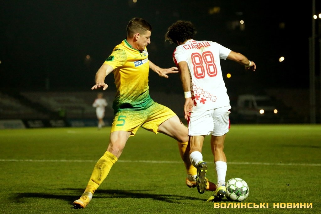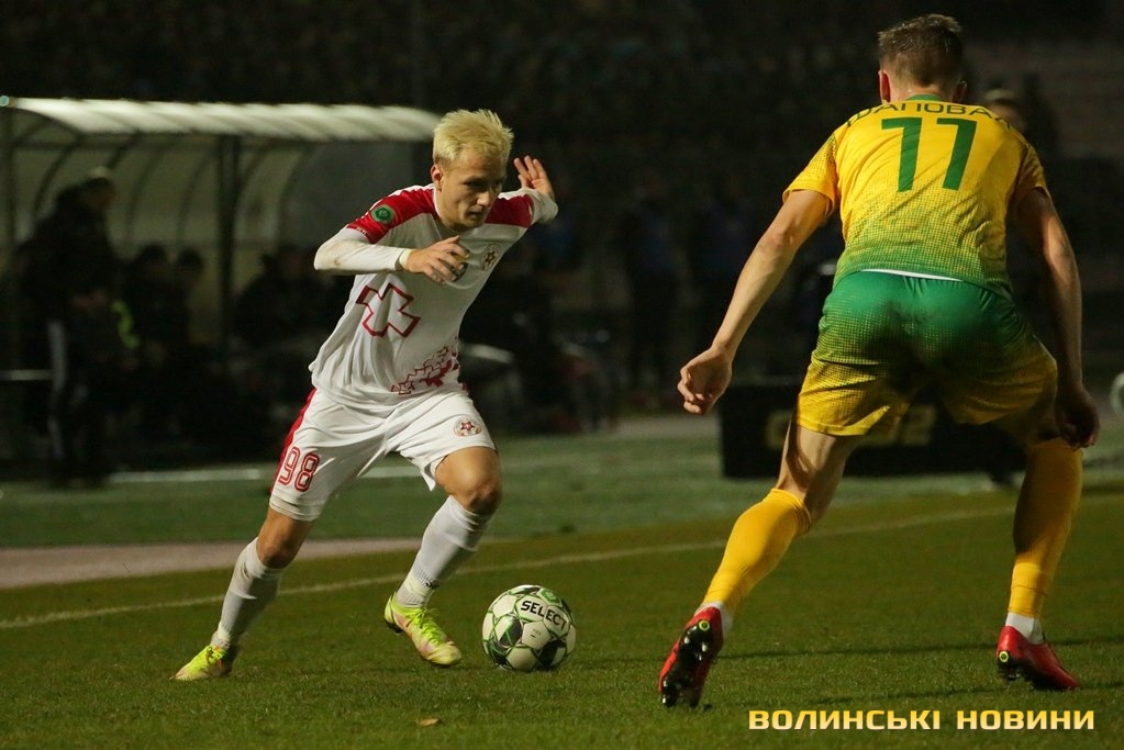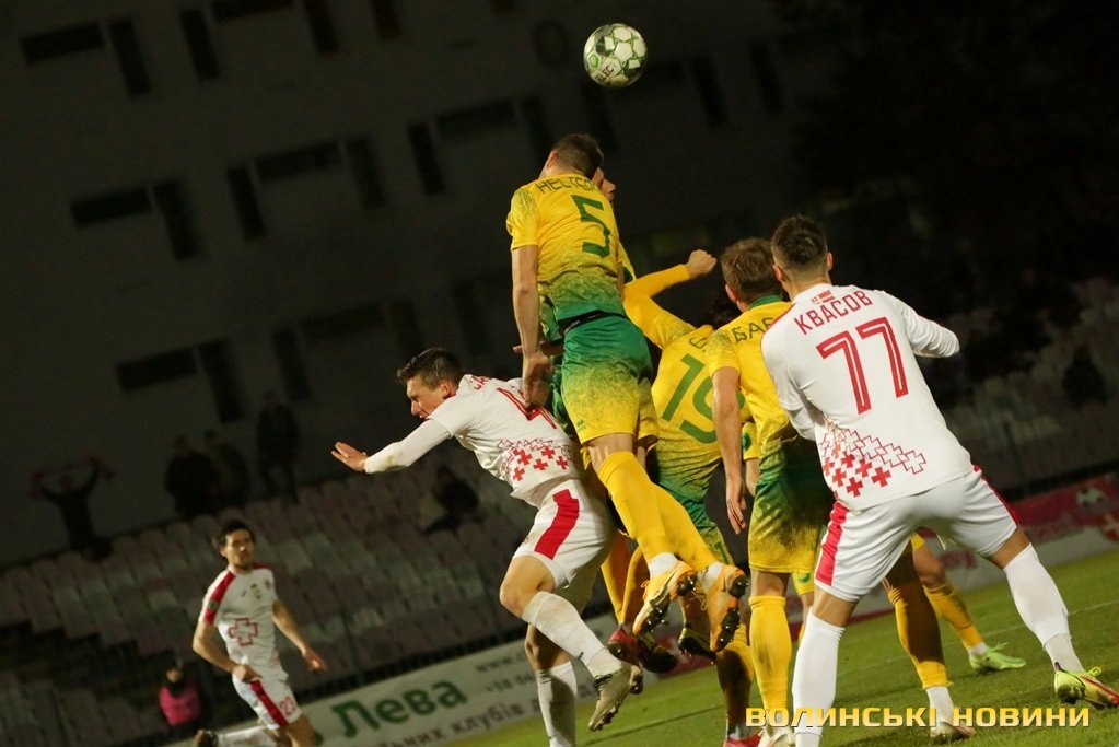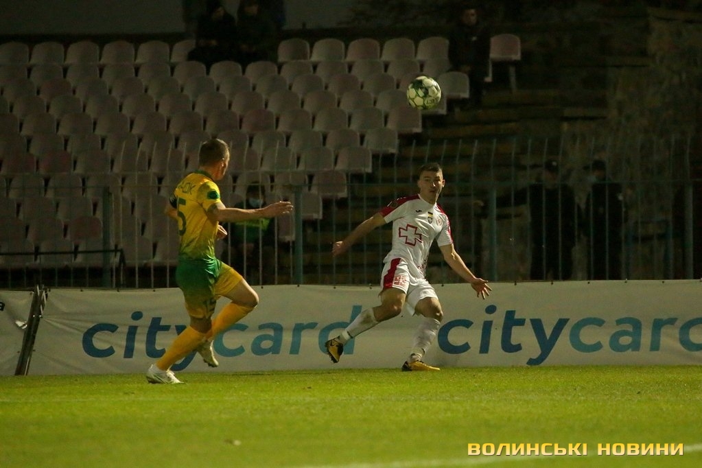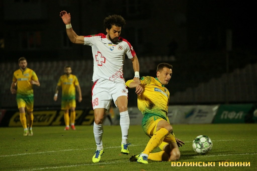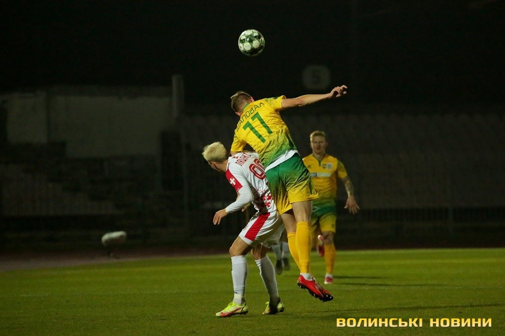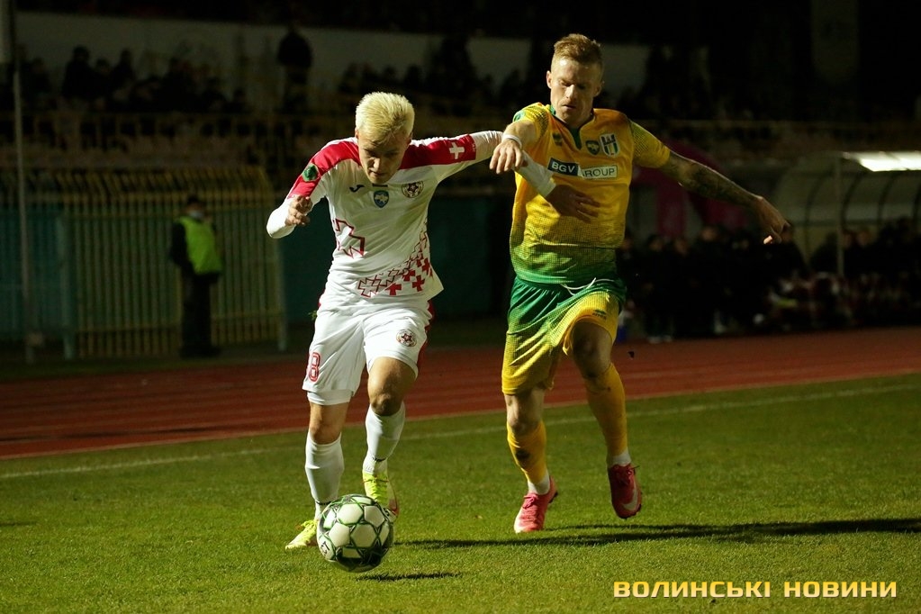 Натомість у «Волині» дискваліфікацію відбули головний тренер Альберт Шахов та півзахисник Артур Рябов. Також в рамку воріт повернувся ветеран Віталій Неділько, який пропускав минулу гру.Гості одразу ж показали, що у цьому поєдинку вони хочуть контролювати м’яч, тож «Волинь» вимушена була грати другим номером. Попри контроль м’яча, житомирянам було доволі складно пробратися крізь насичений захист «хрестоносців», тож нерідко вони пробивали здалеку.