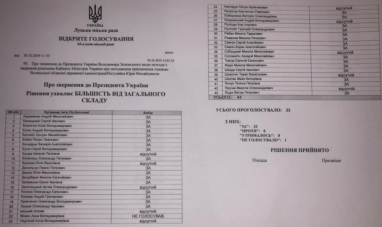 32 депутати Луцької міської ради з 34 фактично присутніх підтримали звернення до Володимира Зеленського щодо неприпустимості призначення луганського правоохоронця Юрія Погуляйка очільником Волинської ОДА. Попередньо його кандидатуру вже погодив Кабмін.