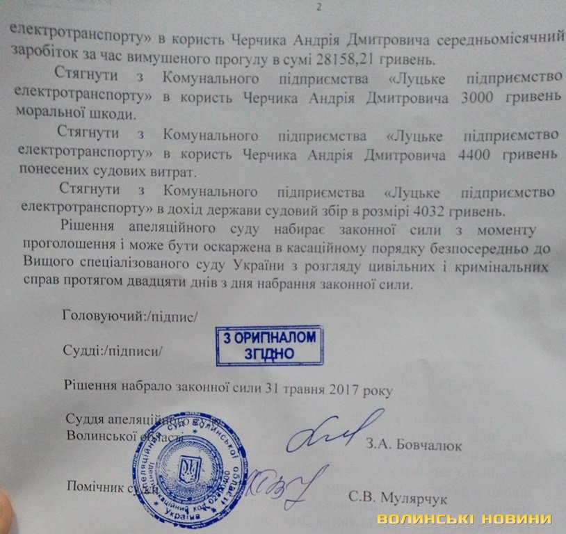 Засідання Апеляційного суду Волинської області щодо розгляду цивільної справу за позовом Андрія Черчика до КП «Луцьке підприємство електротранспорту» про поновлення на роботі та відшкодування моральної шкоди відбулося сьогодні, 31-го травня.