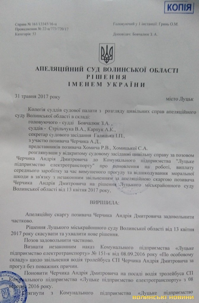 Так, Апеляційний суд вирішив винати незаконним наказ про звільнення водія тролейбуса за прогул без поважних причин. Відповідно, Андрія Черчика поновили на посаду водія тролейбуса з 8 вересня 2016-го року.