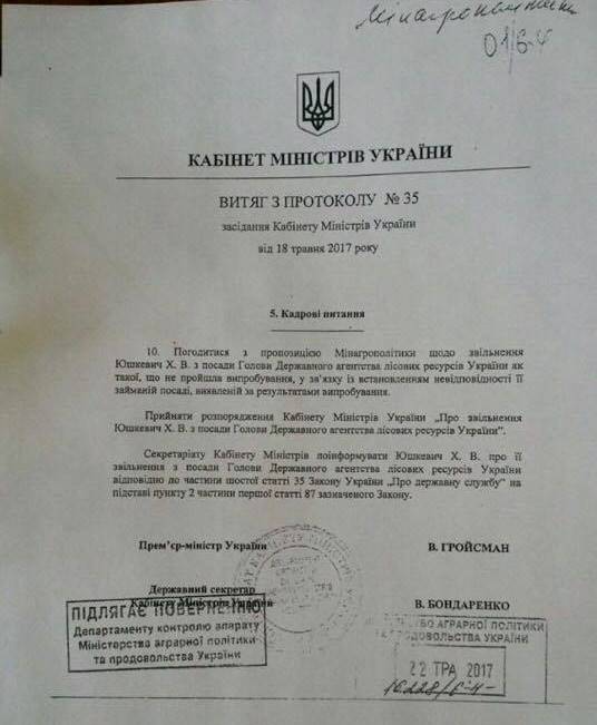 "Погодитися з пропозицією Мінагрополітики щодо звільнення Юшкевич Х. В. з посади голови державного агентства лісових ресурсів України як такої, що не пройшла випробування у зв'язку зі встановленням невідповідності її займаній посаді, виявленій за результатами випробування.