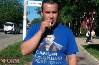 В Ізмаїлі Одеської області учасник АТО змусив прихильників "руского міра" зняти з себе футболку з главою Кремля Володимиром Путіним, після чого порвав її і викинув у сміття.