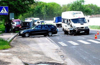 Бус врізався у легковик, який різко загальмував перед школярем. На місці події працюють міліціонери, прибула швидка