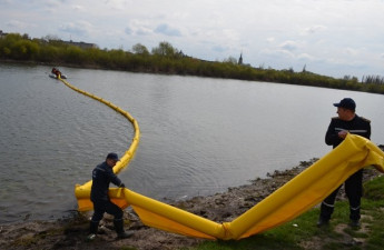 На заплаві річки Стир у Луцьку вчора 17 квітня можна було спостерігати загородження у вигляді новеньких жовтих труб, які трималися на поверхні води