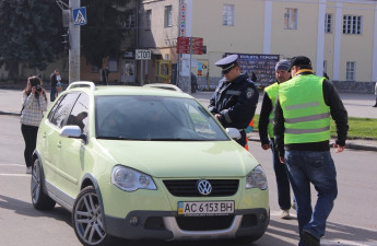 У центрі Луцька масово зупиняють водіїв. Біля центрального універмагу Автомайдан, Волинська Самооборона Майдану спільно із луцькими державтоінспекторами контролюють водіїв щодо дотримання правил дорожнього руху й роздають цукерки