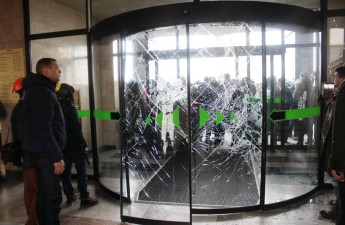 Частина радикально налаштованих мітингувальників, які займали будівлю волинської обласної ради, робили скляні вхідні двері та частину вікон.