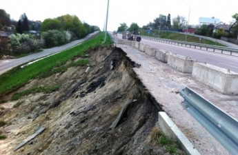 Уздовж дороги перед містом Рівне осунулася частина узбіччя. Добрих 25-30 метрів сповзло до низу разом із бордюрами