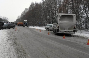 У результаті подвійного зіткнення автомобілів травмовано двох пасажирів, а пішохід, який потрапив під колеса буса, загинув на місці події