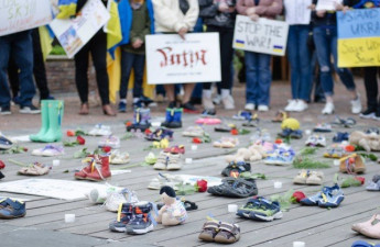В одному з міст Каліфорнії представники української спільноти виклали 128 пар дитячого взуття, аби нагадати всім про те, що щодня кількість загиблих дітей через дії російської армії в Україні зростає