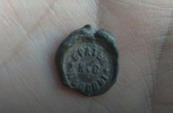 На круглій свинцевій заготовці з обох боків витіснено написи. З одного боку: «Братья Поповы К.С», з другого – слово «...