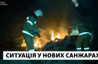 О 19:40 у Нових Санжарах жителі підпалили шини, дрова і почали кидати каміння в поліцію.