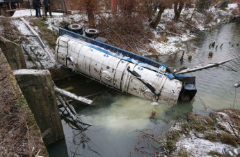 Молоковоз, який з’їхав з дороги і впав у водойму в селі Лище Луцького району дістають з водойми з допомогою двох кранів. Молоко з цистерни почало витікати у воду, через аварію та обрив труби три села залишились без газопостачання.