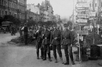 "...Червоною площею повільно, рівним ланцюгом по двоє в ряд рухалися німецькі мотоциклісти. На Андріївській вулиці, куди вони повернули...
