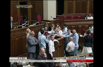 Перший віце-спікер Верховної Ради Ірина Геращенко, яка веде засідання, назвала колег, які блокують трибуну, «парламентськими фріками»