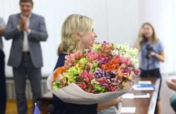 Депутату Луцької міської ради Орисі Залевській колеги по сесійному залу подарували букет в честь народження сина.