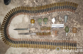 У підсобному приміщенні на території домоволодіння правоохоронці виявили 5 гранат різного типу, запали до гранат, автомат Калашнікова, понад сотні патронів, калібрів 5,45 мм; 7,62 мм; 12,7 мм.