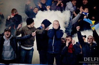 На стадіоні імені Лобановського в Києві під час футбольного матчу Україна - Італія угруповання вболівальників спочатку спалила прапор Італії, а потім почала бійку на трибуні