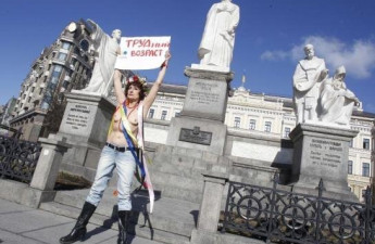 Жіночий рух FEMEN, в особі своєї активістки Ольги Сергіївни, провів моно-мітинг "Важкий вік" проти підвищення пенсійного віку для жінок