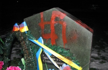 У Луцьку невідомі 10 січня на камені, що встановлений на місці, де має стояти пам’ятник провідникові ОУН Степану Бандері, намалювали червоною фарбою нацистську свастику