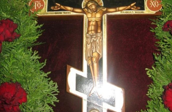 У Хрест вмонтовано частинку Животворящого Хреста Господнього з Єрусалиму