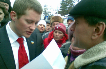 До мітингарів під стінами Луцької міськради вийшли лідер фракції «НУ» Андрій Козюра та Анатолій Бубенщиков