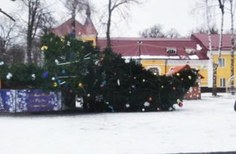 У місті Дунаївці Хмельницької області головна новорічна ялинка впала через сильні пориви вітру.