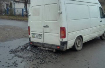 Мікроавтобус Volkswagen провалився заднім колесом у яму, яку недбало засипали комунальники