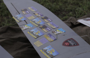 Українські безпілотники скинули кілька тисяч листівок під час військового параду терористів. У такий спосіб військові привітали патріотів, які лишились на Донбасі, з Днем Перемоги