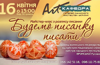 Галерея сучасного мистецтва України «Арт-кафедра» разом з майстринею Волинського обласного осередку Національної спілки майстрів народного мистецтва України Русланою Вронською проведуть майстер-клас з розпису традиційної волинської писанки 16 квітня.