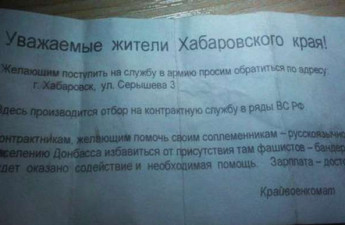 Жителів Хабаровського краю запрошують на контрактну службу в ряди Збройних сил Російської Федерації. Подальша їхня місія полягатиме у знищенні на Донбасі фашистів – бандерівців.
