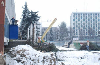 У Луцьку стартувала реконструкція кінотеатру «Промінь»: біля його будівлі на проспекті Грушевського зрізають старі ялинки.