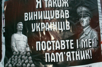 На рекламных тумбах Луцка 19 декабря появились плакаты с изображениями Адольфа Гитлера и Иосифа Сталина и надписью «Я также истреблял украинцев. Поставьте и мне памятник!»