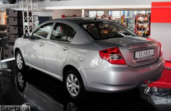 На «Столичному автошоу» в Києві показали перший серійний електромобіль китайської марки Chery - ззовні машина має короткий капот, масивний бампер із решіткою радіатора внизу та великі фари