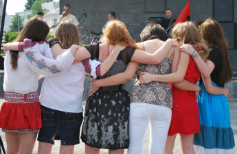 На Театральному майдані Луцька 29 травня День героїв відзначали спільною молитвою, політичними промовами і стягами, хард-роковими «танцями» та патріотичними піснями
