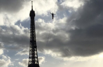 Чоловік пройшов по тросу між Ейфелевою вежею і театром на висоті 70 метрів. Відео
