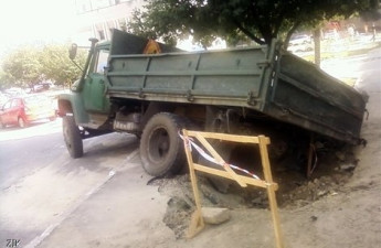 Луцькі комунальники 27-го серпня потрапили в пастку. Їхня машина навантажена піском провалилася під землю
