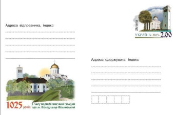Ювілейний конверт із зображенням Успенського собору, що у Володимир-Волинському півмільйонним тиражем випустила «Укрпошта». Такий подарунок волинянам - з нагоди відзначення 1025-річчя Володимир-Волинського, - повідомляють у прес-службі ОДА.