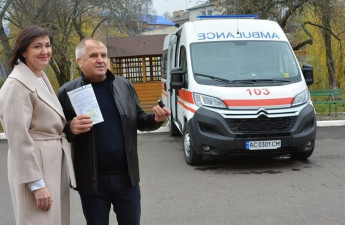Голова обласної ради Ірина Вахович вручила ключі від новенького автомобіля швидкої допомоги виконувачу обов'язків директора КП «Волинський обласний центр екстреної медичної допомоги та медицини катастроф» Володимиру Шмалю.