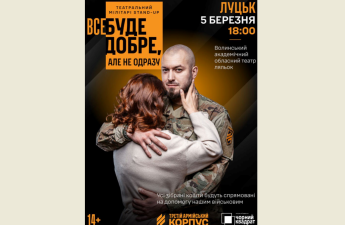 5 березня о 18:00 в Луцьк у Волинському академічному обласному театрі ляльок відбудеться мілібарі-стендап «Все буде добре, але не одразу» – трагікомедія про героїзм в простих речах, про справжнє кохання, чорний та білий гумор.