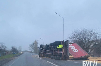 Внаслідок аварії транспортний засіб перекинувся та зазнав значних ушкоджень. Зерно розсипалось по узбіччю та дорозі.