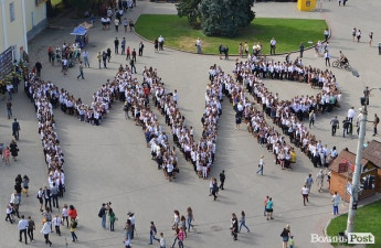 У Луцьку відбулася акція «Українська вишиванка», учасники якої вибудувалися у слово МИР.